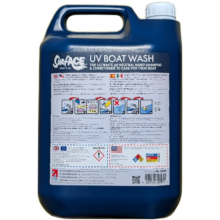 Surf-ACE Marine UV Boat Wash - Wash Down Concentrate & Surface Conditioner, 5L (M-10005) is a super-concentrate UV Boat Wash is a low foaming biodegradable shampoo and surface conditioner designed for regular washdowns of all topside hard surfaces. A 5-liter container will make over 150 gallons of boat wash and surface conditioner.