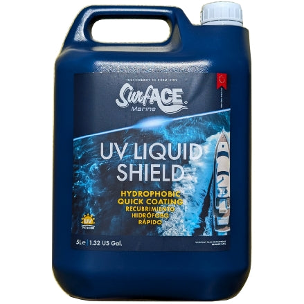 Surf-ACE Marine UV Liquid Shield - Hydrophobic Quick Coating, 5L (M-60005) is a multi-surface, rapid action, high gloss, UV protective sealant for use on surfaces such as gelcoat, topcoats, glass, plastics, stainless steel, as well as Bimini tops.